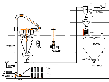 ⑼ 淀粉氣力輸送系統:淀粉顆粒不大,粉狀,比重較小,沉降性不大,輸送性高,采用正壓(壓送)技術,還可以采用負壓(吸送)技術。正壓(壓送)輸送系統使用羅茨風機制造的風輸送淀粉,羅茨風機安裝在氣力輸送管的前端,風直接吹入輸送管中,淀粉使用加料器加入管道中,風將混合的淀粉輸送到旋風分離器后卸料進入淀粉貯罐,旋風分離器出來的可以使用除塵器再一次回收淀粉。負壓(吸送)輸送系統是使用離心風機吸引的風輸送淀粉,氣力輸送管的末端安裝旋風分離器,旋風分離器的末端安裝離心風機。淀粉落入吸風口后既被吸入氣力輸送管道,然后進入旋風分離器,旋風分離器將淀粉分離下來(或經過篩分)進入淀粉貯罐。