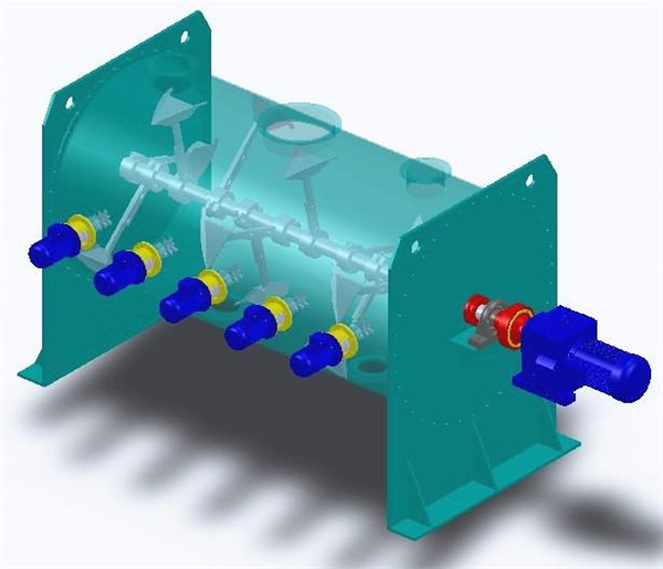 物料在上述犁刀和飛刀的復(fù)合作用下,不斷更換、擴(kuò)散、在較短時(shí)間內(nèi)達(dá)到均勻混合,混合精度較高。